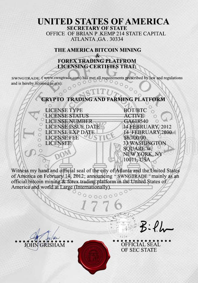 SWNTRADE (www.swngtrade.com) has met all requirements prescribed by law and regulations and is hereby licensed as a(n): LICENSE NUMBER is GA618540 LICENSE was issued 14 February, 2012 To Expire 14 February, 2030 Witness by hand and official seal of the city of Altanta and the United States of America on February 14, 2012; announcing SWNGTRADE mainly as an official bitcoin mining & forex trading platform in the United States of America and world at Large (Internationally).